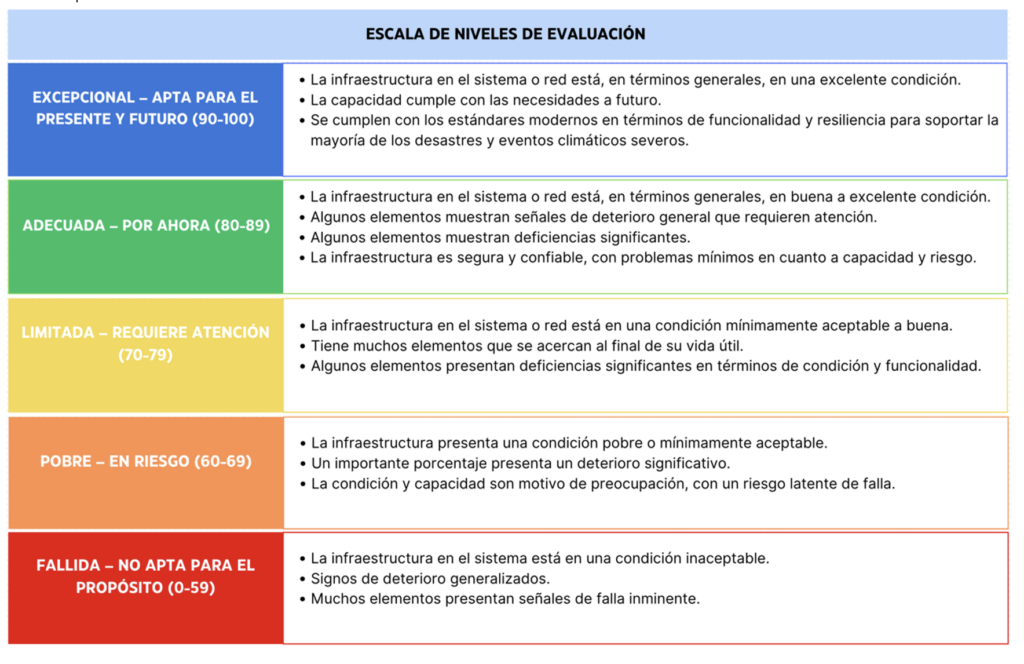 Para generar esta calificación se utilizaron ocho dimensiones: Capacidad, Condición, Fondeo, Necesidad futura, Operación y mantenimiento; Seguridad, Resiliencia e Innovación.