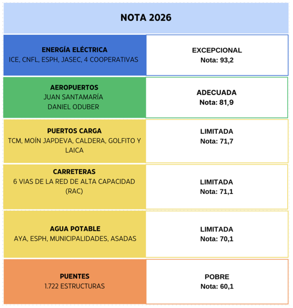 Con el objetivo de contar con una herramienta para el diagnóstico y niveles de condición de la infraestructura de uso público en el país, el Colegio Federado de Ingenieros y de Arquitectos de Costa Rica (CFIA), la Escuela de Ingeniería Civil de la Universidad de Costa Rica (UCR)  y la Escuela de Ingeniería en Construcción del  Instituto Tecnológico de Costa Rica (TEC); en conjunto con 30 profesionales especialistas en distintas áreas; creó el Reporte de Infraestructura 2026.