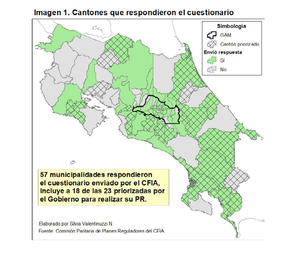 El trabajo se basó en la aplicación de cuatro cuestionarios en línea. Uno se dirigió a todas las municipalidades, para conocer la situación de su plan regulador urbano o cantonal (67% de respuesta, 56 municipalidades y 2 concejos de distrito); y otro, específico para municipalidades costeras (60% de respuesta, 12 municipalidades y 1 concejo de distrito), indagó sobre los PR costeros (PRC) en la zona marítimo terrestre (ZMT). Los dos restantes se aplicaron a firmas consultoras e instituciones con competencias de revisión y aprobación de PR.